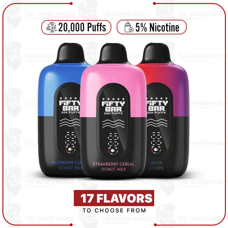 The Fifty Bar V2 20000 Puff Disposable Vape uses premium e-liquid from Beard Vape Co. It features dual parallel mesh coils for smooth hits up to 20,000 puffs.