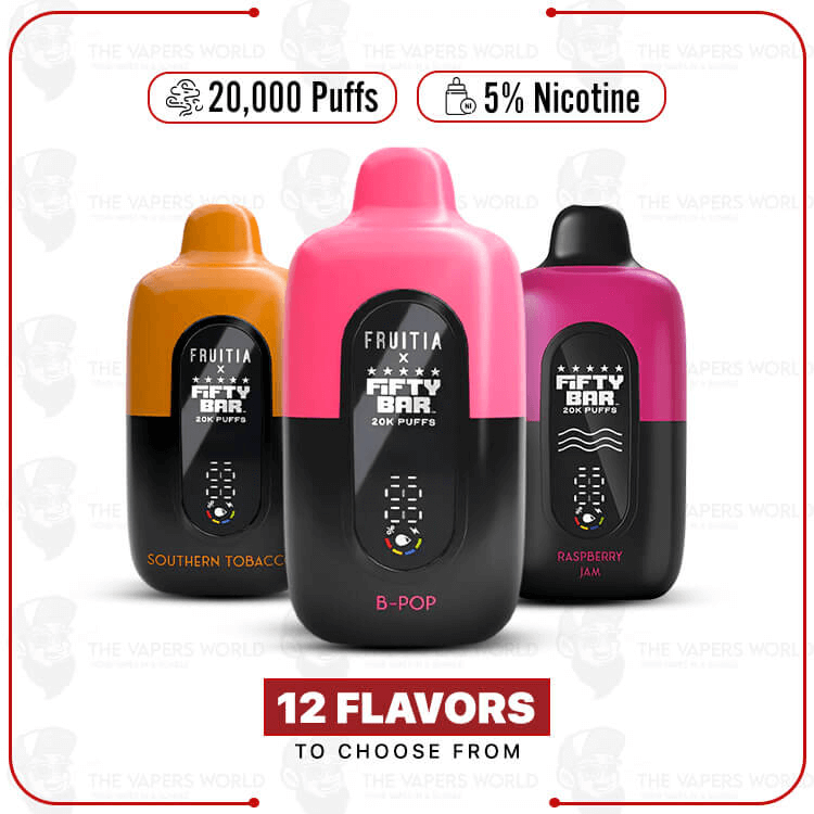 The Fruitia x Fifty Bar 20K Disposable Vape combines Fruitia’s flavors with Fifty Bar’s technology. It features smooth draws, steady performance, and a compact design.